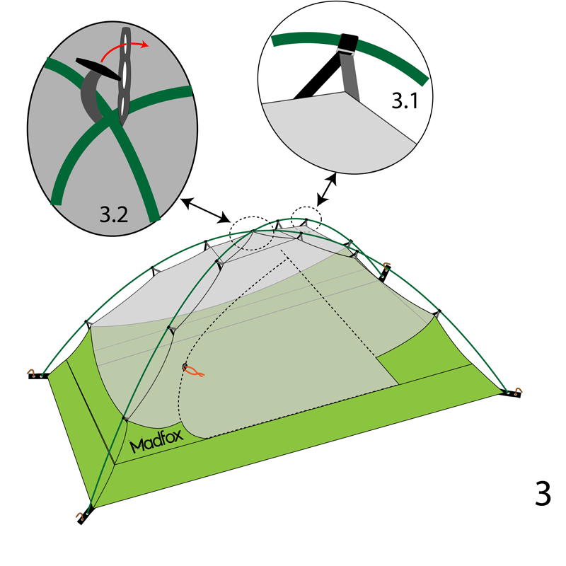 3.1 Cài các clip hook được tích hợp dọc theo thân lều vào khung lều để tạo hình lều
