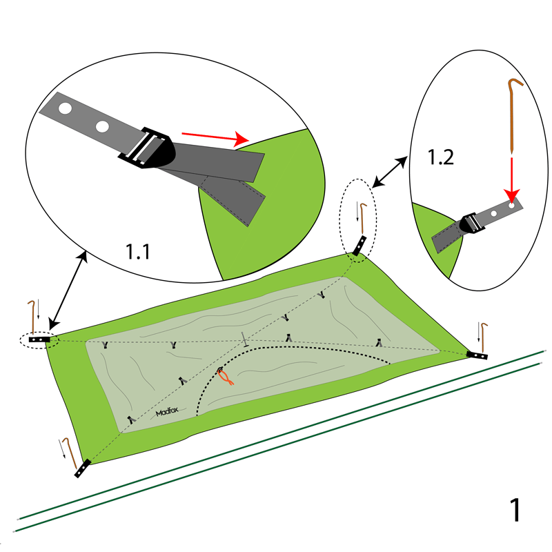 4.2 Cài đầu khóa đực cố định từ tấm phủ với đầu khóa cái của đáy lều ( áp dụng cho 4 góc)