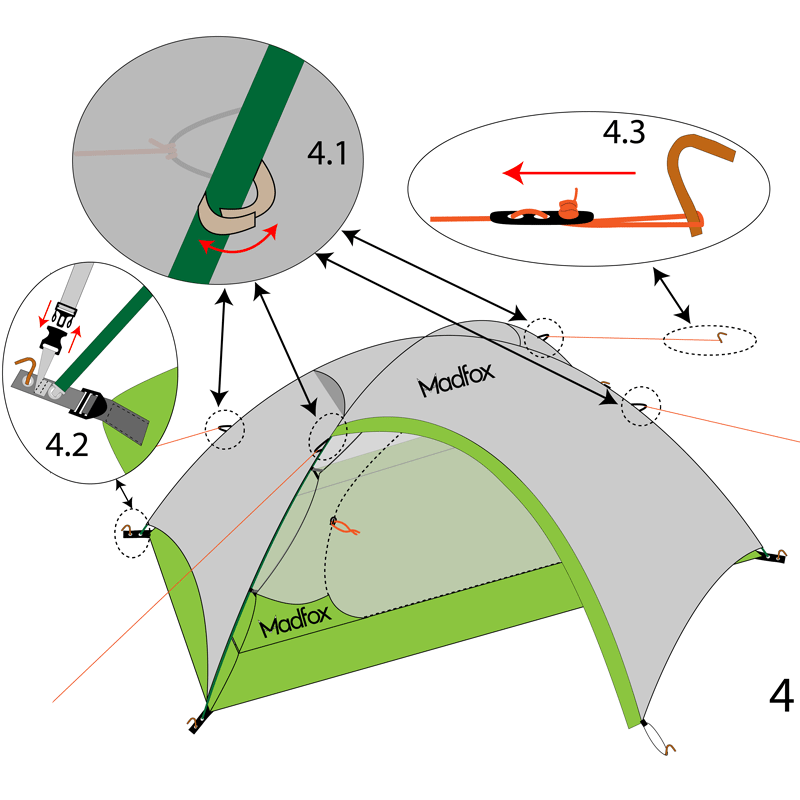 4.3 Móc guyline vào cọc lều sau đó tăng đưa cho căng dây đầy đủ có cả 6 góc ( xem thêm cách sử dụng guyline tại đây)